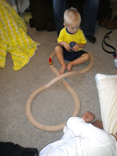 Isaac has officially entered the trains phase!! Several times a day he points to the TV and says "choo choo". I then ask him if he wants to watch Thomas the Train and he gets really exited and says "yes" "yes." He is always carrying around his trains and wants to sleep, eat, and travel everywhere with them. The only way I can get Isaac to brush his teeth without pinning him down is to say, "Isaac your trains want to watch you brush your teeth" and I hold the train up to his face and brush at the same time.