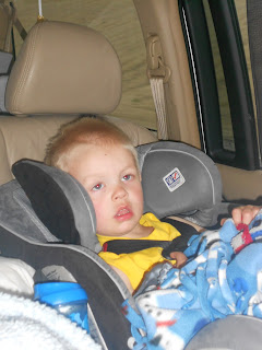 A few hours later and this is what they looked liked. We cranked up the ac for me so it was pretty cold in the car. I think the boys liked the reclined seats though, they fell asleep shorty after this picture was taken.I was so proud of the boys. They only needed one movie on the first day of our trip. I was pleasantly surprised at how well they did.